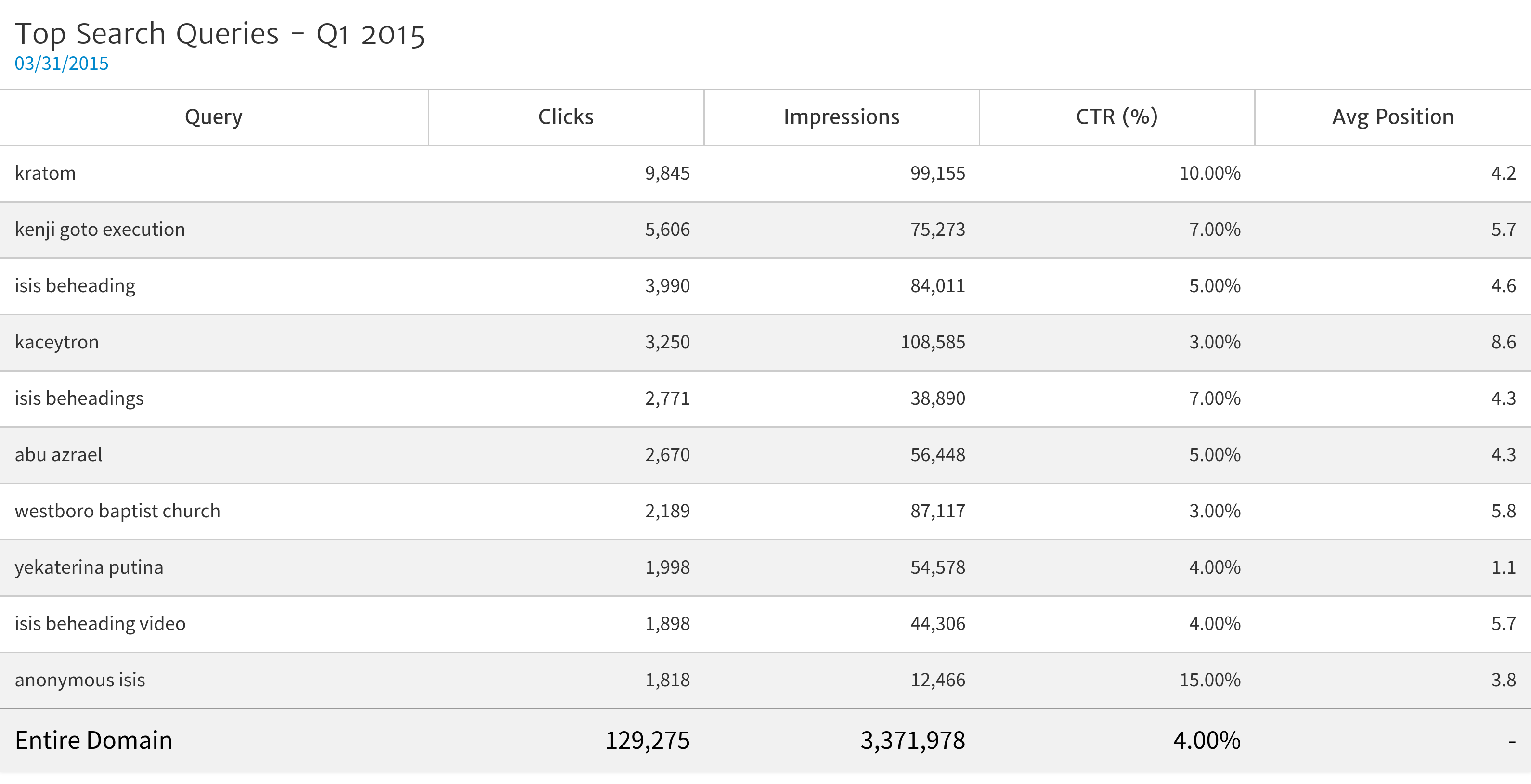 Next, we use the date picker to select the last day of the quarter - in this case March 31. Also, for the Date Range, pick the "Last 90 days." The result is a table showing the Search Queries sending the most traffic to the website during the previous quarter.
