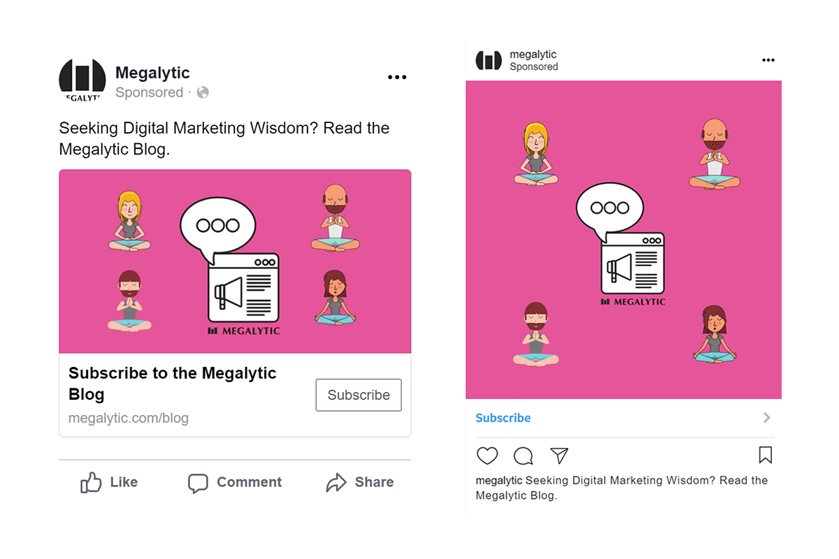 Instagram images are typically more square than on Facebook. For example, below is a side-by-side comparison of the Facebook and Instagram versions of a Megalytic Blog subscription lead ad. These are both mobile ads, but you can see that the Instagram version is noticably more square.