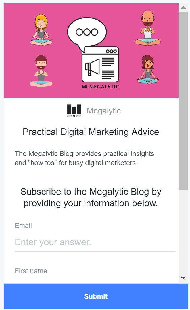 Below is an example Intro section from a form used in a Megalytic Blog subscription campaign. It is designed to make it clear that the user is subscribing to a blog about Digital Marketing.