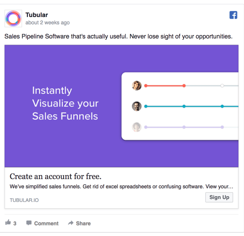 You can also improve performance by providing clear text that works with the CTA button. For example, in this ad by Tubular, the text "Create an account for free" works well with the "Signup" CTA button.