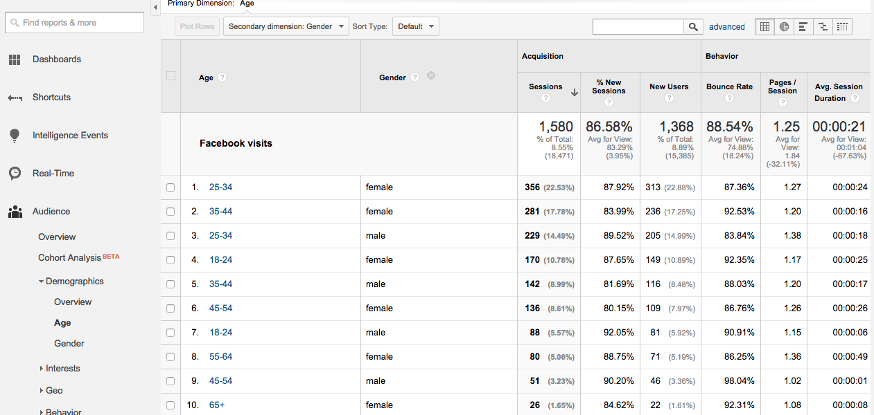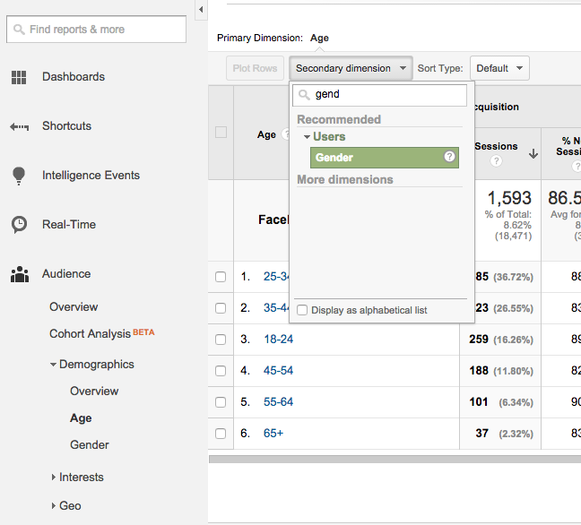 Select the “Secondary Dimension” and search for “Gender” and choose this dimension. Now, you can see a complete breakdown of Facebook visitors by age and gender.
