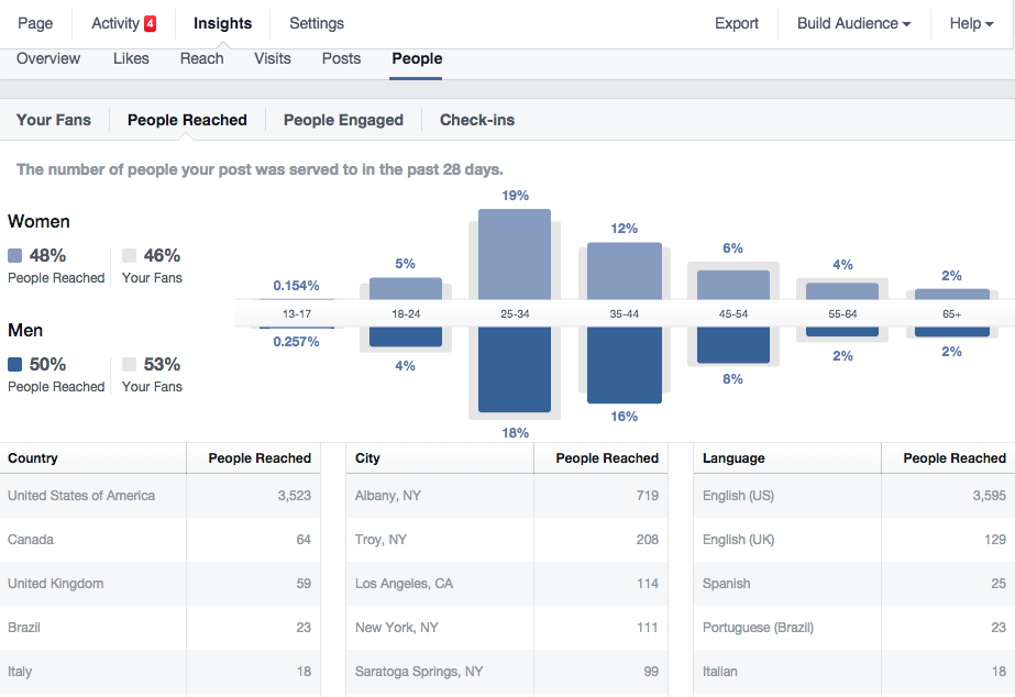 The “People Reached” report shows the people who saw your posts, whether they like your page or not. Reach can actually include your fans, friends of anyone who’s liked or commented on a post, or people targeted with promoted posts – anyone who may have encountered your content on Facebook. Because of this, demographics of the audience actually reached will often vary a bit from the people who like your page, especially if you’re running paid promotions. Note in this example that women aged 25-34 slightly outnumber men in the same age bracket, whereas the reverse was true for fans.