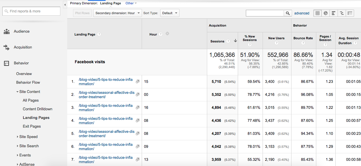 Navigating to the Behavior > Site Content > Landing Pages report, we can break down the performance of specific pages from Facebook visitors and further segment by hour. This way, we can see not only what content was most popular but at what time people were most likely to click through to view that content.