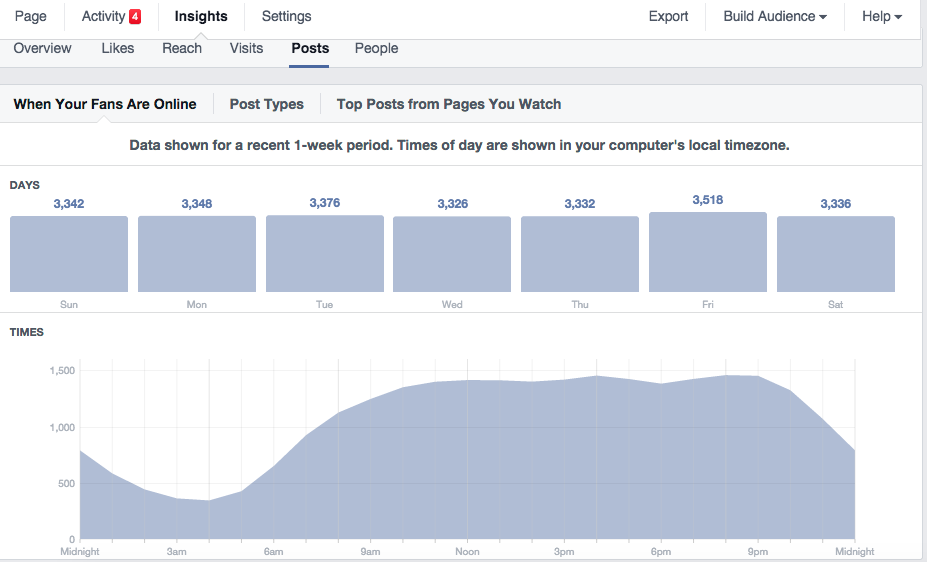 In this example, we can see that day-to-day usage does not vary much, but time-of-day usage dips from evening to the next morning. Page fans are online at a consistent level for a large portion of the day.