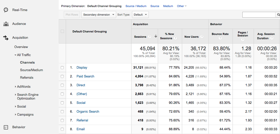 In this example, we see that while YouTube drives a fraction of the sessions coming from Facebook, Pinterest, and Twitter, that sessions from YouTube show a much higher Avg. Session Duration and Pages/Session than any other channel. This data confirms that the traffic from YouTube is of very high quality.