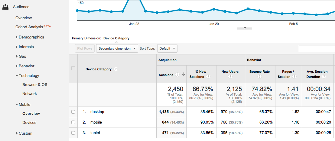 Overall, desktop visitors show better engagement, as well as a higher conversion rate. While shorter time on site tends to be common with mobile usage, the low conversion rate is a red flag. The site owner should look at how the newsletter’s call to action to sign up is presented to mobile visitors and should consider perhaps making it more visible or testing the signup form on a phone for usability issues.