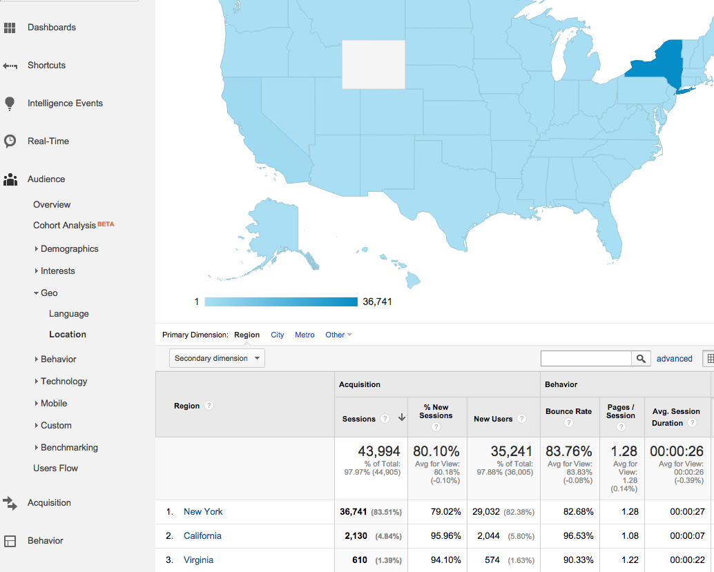 Geographic data comprises another important part of demographic information. We can view a geography breakdown in the Views report, which shows the majority of views coming from New York, again reflecting the desired target audience’s location.
