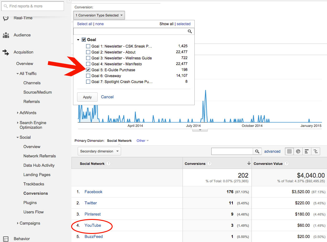 In this report, start by selecting a specific goal from the Conversion Type drop-down at the top. We’ve already determined YouTube’s effectiveness in driving newsletter signups, so this time we’ll choose a Goal directly connected to revenue, downloading an e-guide that sells for $20.