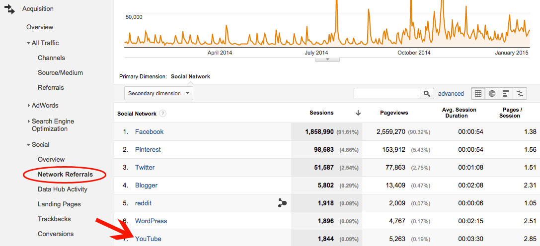 To access this information, navigate to Acquisition > Social > Network Referrals. As long as you’re receiving referrals from YouTube, you will see it in the list of social networks. This will help you see how YouTube measures up against other networks.