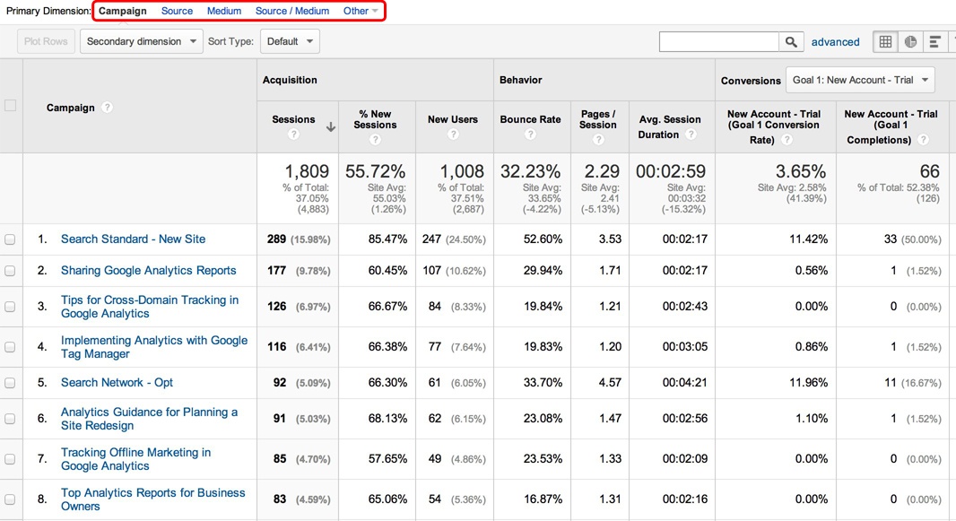 At the top of the report, there is a menu (circled in red) where you can select different dimensions for the first column. For example, rather than looking at this data via campaign, you may want to view it via Medium (e.g., cpc, email, social, etc.).