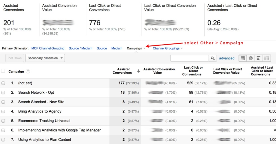Another report that can be used for great campaign insight is Assisted Conversions (Conversions > Multi-Channel Funnels > Assisted Conversions). Here, you can see which campaigns are contributing the most to revenue. To configure this report to show campaign data, click on “Other” in the “Primary Dimension” menu at the top of the table, and select “Campaign.”