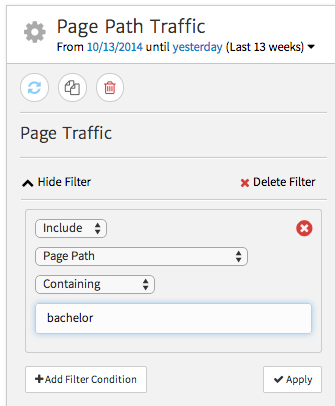 As mentioned, the college executives are especially concerned with seeing interest in their bachelor’s degree programs. To show this information, she can add a Page Traffic widget and filter it to show only pages relevant to the bachelor’s degree programs.