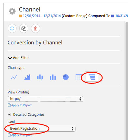 She’ll choose the far right bar graph option and then use the “Goal” dropdown to filter by a specific Goal. In this case, the “event registration” Goal includes the data she wants to display. After applying changes, the final widget breaks down Goals by channel.