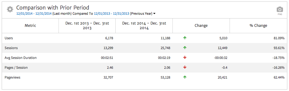From this data, note that Users, Sessions and Pageviews increased significantly from the previous year. However, Average Session Duration and Pages/Session decreased slightly.