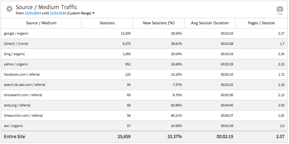 Every online marketing report should show how people are finding a website, whether through organic search, pay-per-click advertising, social media, email campaigns or referrals from other sites. To show this data, our in-house marketer will include a Traffic by Source/Medium widget and, for the sake of this report, set the date range to December.