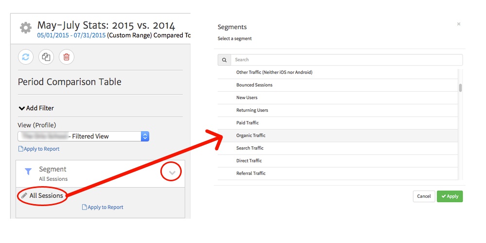 Next, we’ll click the default “All Sessions” Segment. This will open another option to choose a different Segment—allowing you to select from both the default Google Analytics Segments and custom Segments you’ve set up. We’ll select Organic Traffic. Note that you can use the search bar to quickly filter to a specific Segment. Once we’ve chosen a Segment and applied to a report, the numbers will update to reflect the data we want to show.