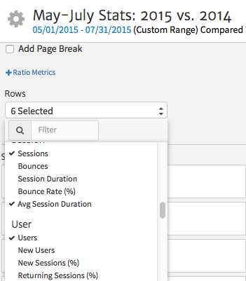 Next, you can add or remove metrics from the default set using the “Rows” dropdown. To add a metric, simply click it in the list so a checkbox appears; to remove an existing metric, click it so the checkbox disappears.