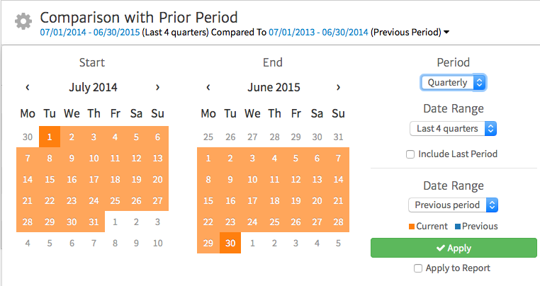 You can also customize the date ranges you’d like to compare using the dropdown from the date at the top of the widget. For instance, you may want to show stats on a quarterly level as opposed to monthly to provide a “big picture” overview of results, or choose a custom date range to measure results from a particular campaign. You can also choose a comparison date range, using default options for the previous month or year, or set a custom range.