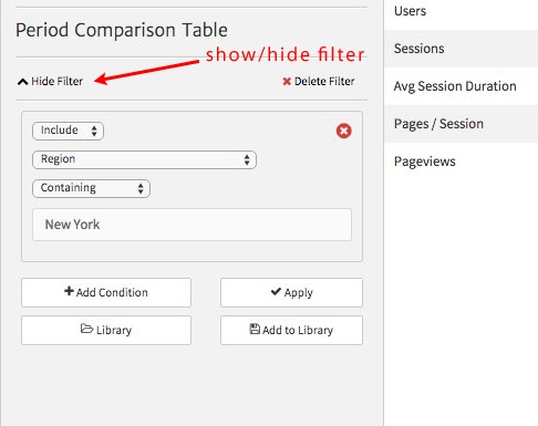 Within the widget options, select “Show Filter,” and then begin customizing your filter. For this example, we want to show traffic from within New York State, so we choose to filter by Region and enter New York into the text box. Note that you can apply multiple conditions within a filter. Now, we simply need to apply this filter to the report to update the data.
