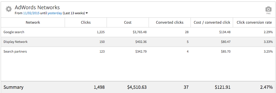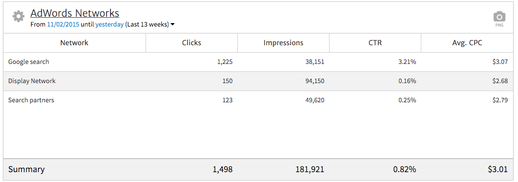 When you first add the AdWords Networks widget, you’ll be asked to choose the AdWords account you’d like to connect. Now, you’ll see a table showing a default set of data for your account, broken out by Google search, display network, and search partners.
