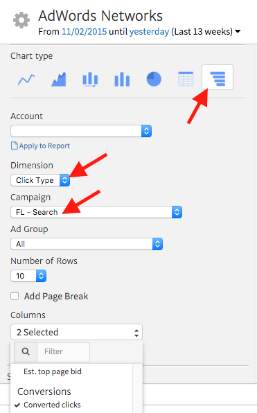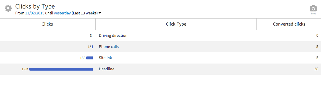 This widget also allows you to choose Click Type as a dimension, comparing click volume for ad headlines, sitelinks, phone calls, and map directions. You can also look at conversions that occurred from each of these.