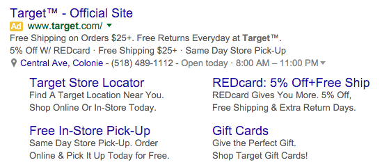 Ad extensions are a type of ad format that show extra information about your business, “extending” your ads, and providing users with alternative click options beyond the ad headline. For instance, in the Target ad below, you can click on the store address to get directions in Google Maps, or you can click any of the four sitelinks below the main ad. If you searched from a mobile device, you could even click to call the store directly instead of going to the site.