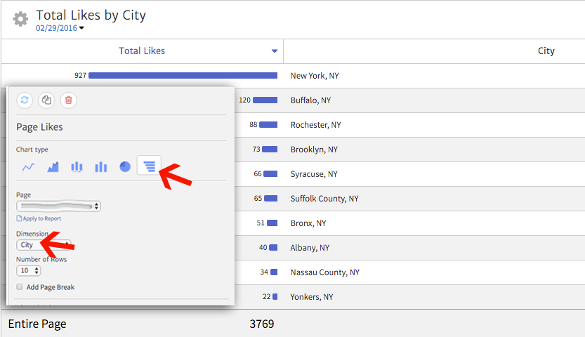For this example, we’re showing insights from a page representing a legislative interest group in New York. The top cities represent areas where the messages from this group are being heard. This data can help show if the organization’s messaging is reaching the right legislative districts. Changing the Dimensions dropdown to City and updating the chart type to Table Graph allows us to list out the cities, showing the difference in the overall volume of Likes.