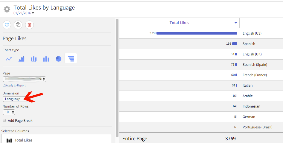 Finally, you can show the languages spoken by the people who like your page. This insight can help you to know if you should be translating marketing materials for foreign speakers or even creating dedicated pages for other languages. We’ll use a setup similar to the Likes by City widget, selecting Language as the dimension instead.