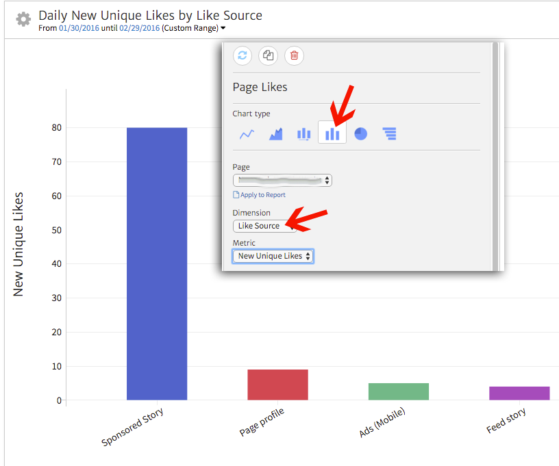 Choose “Like Source” from the Dimension dropdown to show this breakdown in your report. In this instance, we’ll choose a bar graph to be able to easily compare the Like sources.