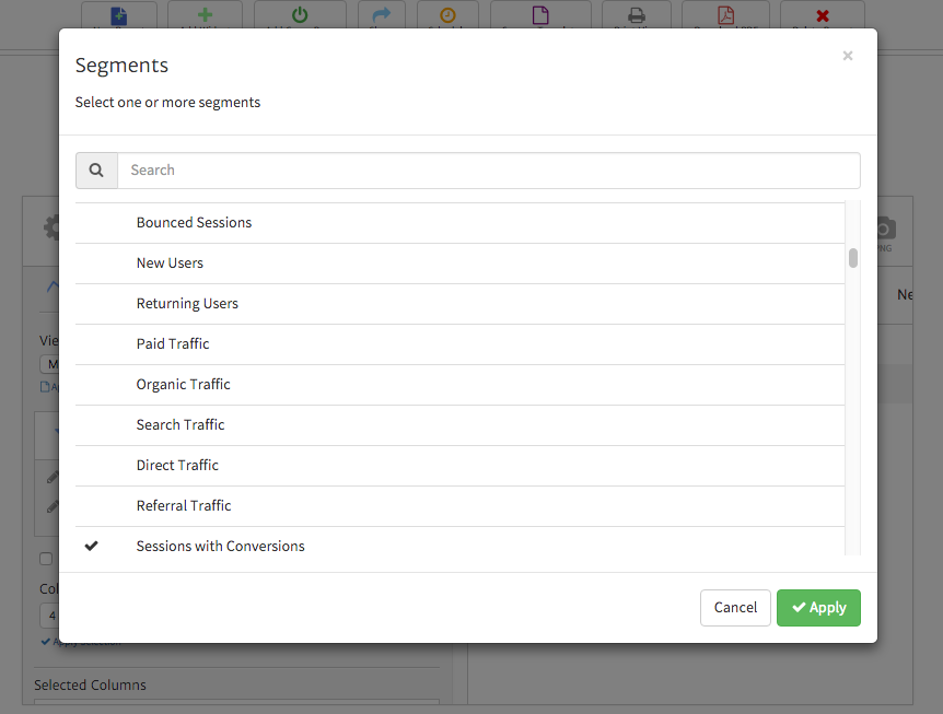 Next, below the dropdown where you select your Analytics view, you’ll see another dropdown to select the segments you’d like to use in your report. Click the arrow and then click any segment to open a window where you can choose from segments to apply. Here, you can select either a system-defined segment, or any custom segment that has synced from the Analytics accounts that authorized your Google Analytics connections. If the choices are too abundant, the search bar can help you quickly find particular segments you want to use.