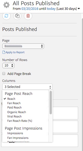 To change which metrics appear in the report, use the Columns dropdown. You can choose up to four metrics to appear next to your posts from the following options: