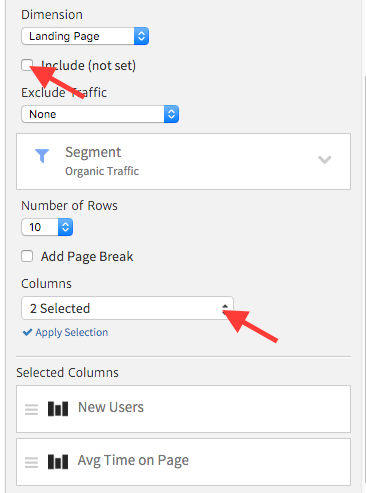 We’ll also choose to exclude “not set” pages (where a URL isn’t visible in Google Analytics) by unchecking the Include (not set) box. In addition, we’ll use the Columns dropdown to select our desired metrics. In this case, we select New Users and Avg. Time on Page to show the client new people who have discovered the site from organic search, as well as gauge how well they engaged with each page.