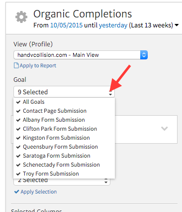 Upon adding the widget to your report, apply the Organic Traffic segment as before. You can use the Goal dropdown to choose what specific Goals you do or don’t want to include in the widget. You can also use the Columns dropdown to choose what metrics you want to show; in this case, we’ll keep the default Completions and Conversion Rate.