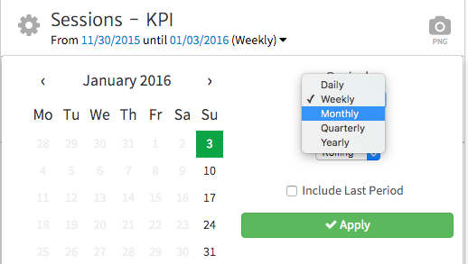 You can use a single KPI widget to highlight one specific metric you want to call out. Look for the widget labeled simply as KPI, add it to your report and select your desired Google Analytics view. Next, customize the widget to show data for your desired timeframe: weekly, monthly, quarterly or yearly. Then, select your timeframe from the Period dropdown under the date section of the widget, and use the calendar to choose the specific date range you want.