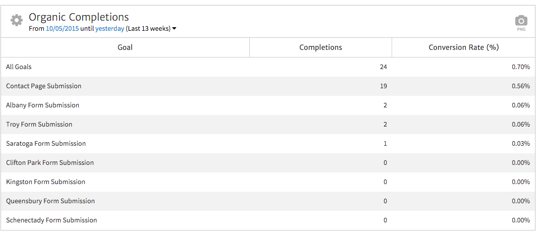 After configuring the widget, you’ll see a breakdown of organic Completions by Goal, along with Conversion Rate for each. Here, we can show that the majority of users are filling out the main contact page form, while location-specific forms are receiving less attention. This may identify an opportunity to make other forms more prominent across the site to increase conversion rate.