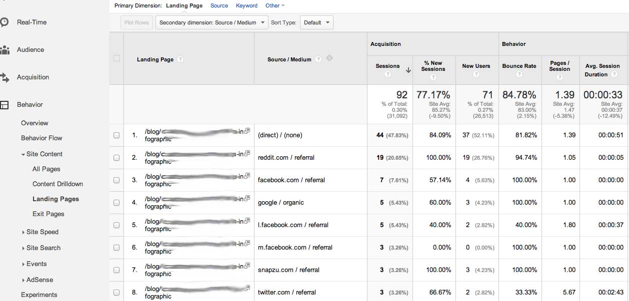 So, how exactly does this happen? Let’s take a look at the results from an infographic that was promoted primarily via social media with a shortened URL. The stats are segmented by Source/Medium for a specific landing page.