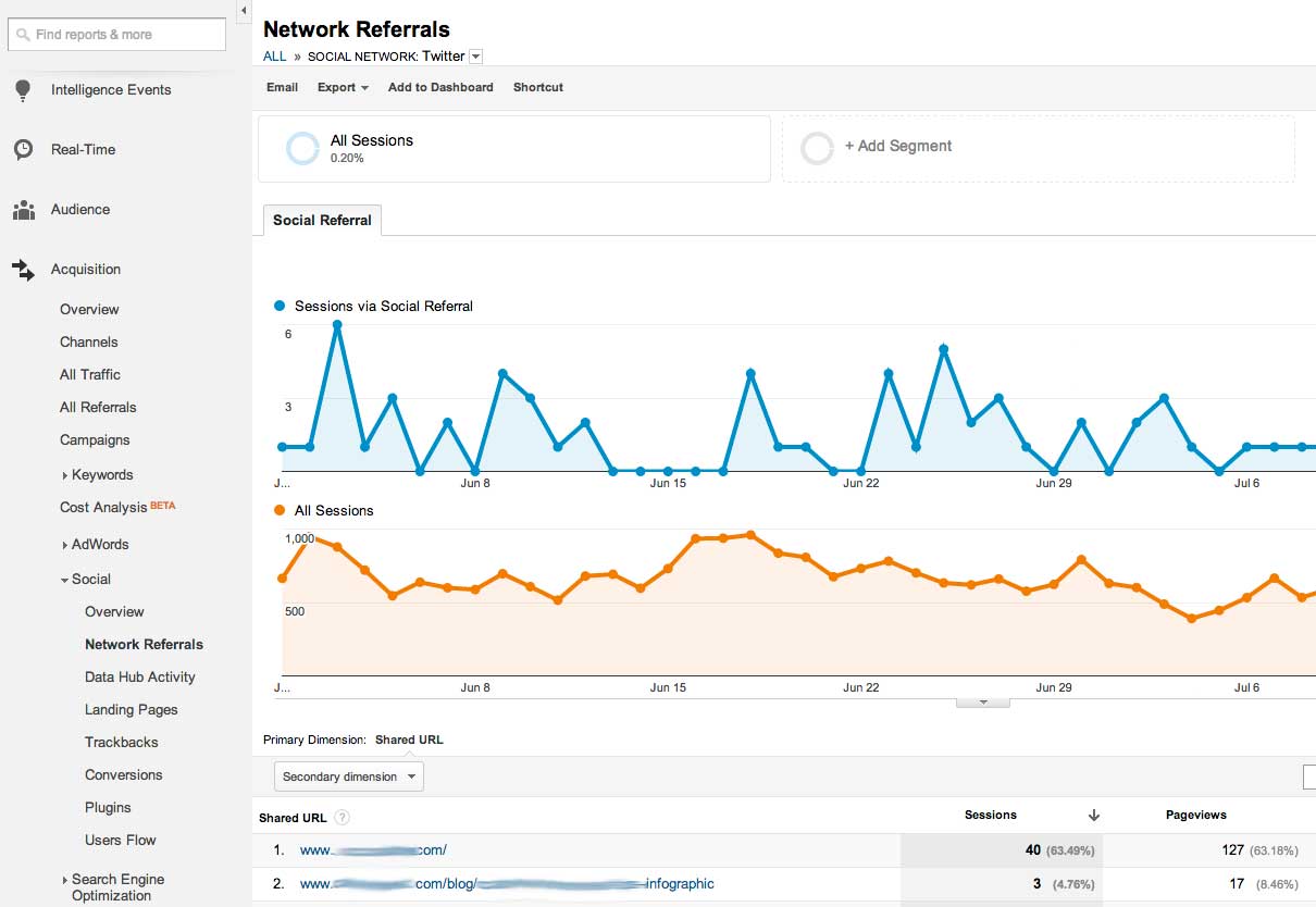 The screenshot below shows referrals from Twitter in the Social > Network Referrals report, after clicking on Twitter to segment specifically to that channel. The second link on the list is the same infographic from the previous report, with just three visits reported here as well.