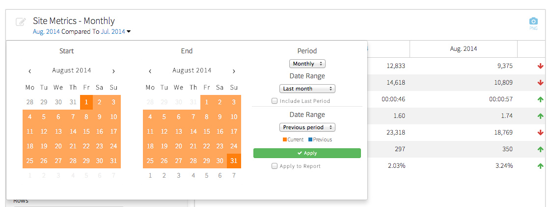 If you’re using Megalytic for reporting, you can also easily compare date ranges within a number of widgets. For example, the “Period Comparison Table” widget shows stats and percentage changes for the date ranges range of your choice. Here we’ve added the widget to a report, and given it the title “Site Metrics – Monthly”. Now we just click the dropdown by the dates at the top of the widget and select the months you’d like to compare.