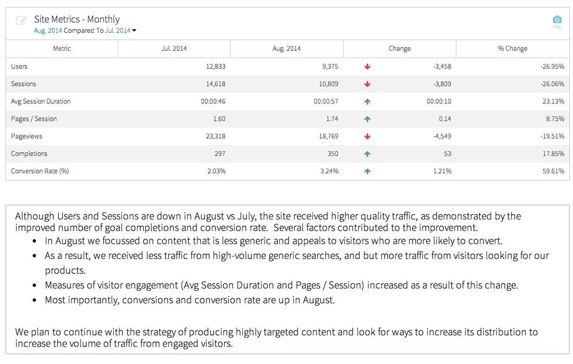 All this information helps guide a client or boss to look beyond surface statistics to understand the actual state of the website’s performance. In order to ensure whoever reviews the report understands the context and explanation behind the numbers, add a comment in the report explaining any potential concerns and pointing to what you consider positives and negatives.