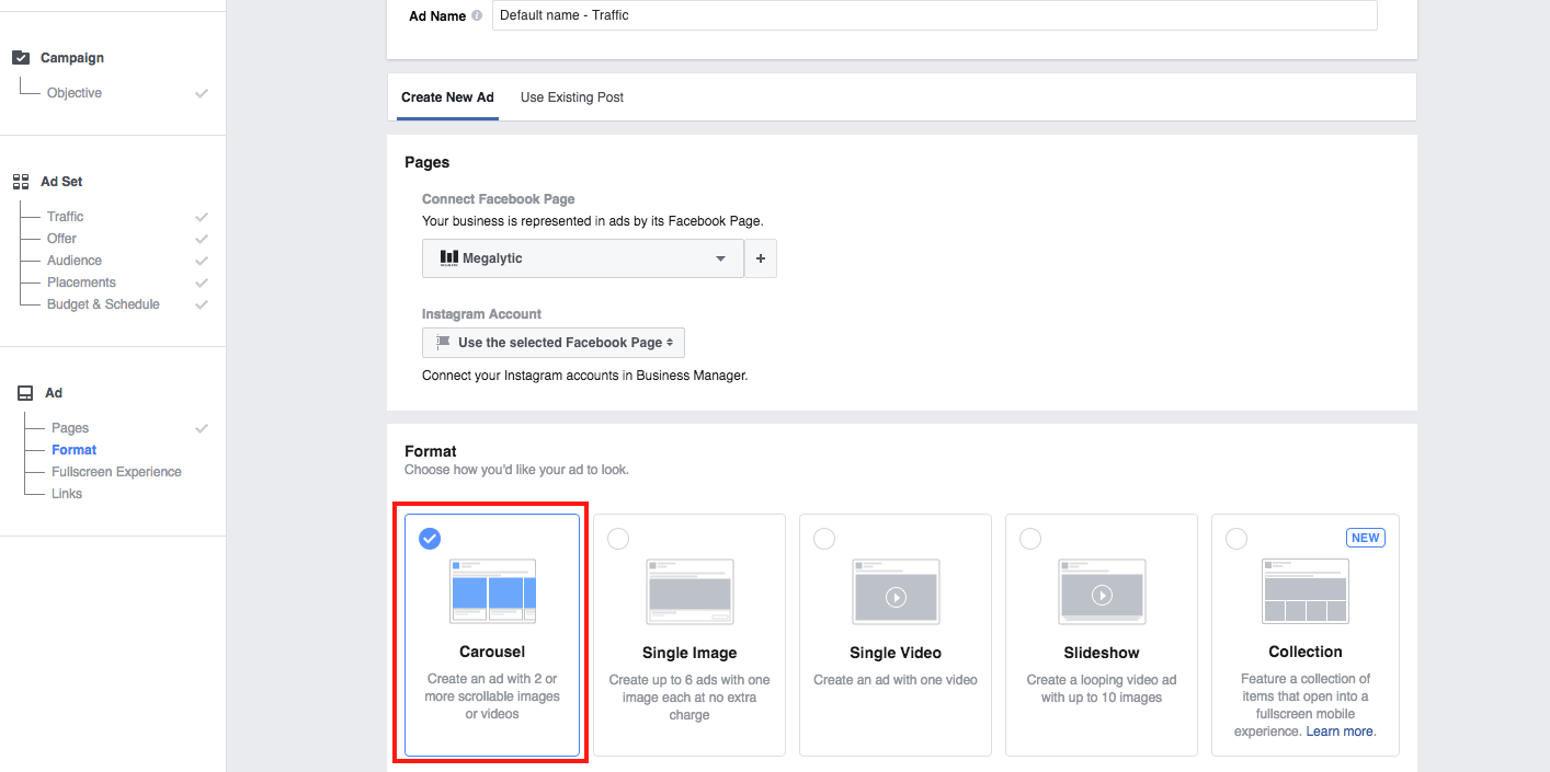 Once you’ve begun to build a campaign and defined your ad group targeting (see our Facebook Ad Manager guide for more details), you can create an ad. After defining which Facebook page and Instagram page (if you have one) the ads should come from, choose “Carousel” for the ad format.