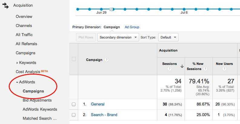 You’ll then start to see data from AdWords show up under Acquisition > AdWords, as well as under Acquisition > Campaigns.