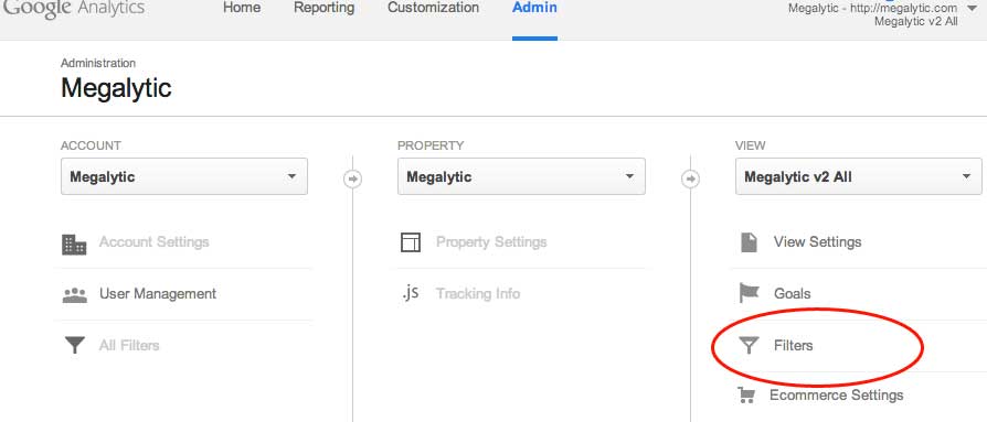 Once you’ve collected the IP addresses you’d like to exclude, you’ll need to create a custom filter. Go to the Admin section of Analytics and select the appropriate Account, Property, and View from the dropdowns. Then, select “Filters” in the View column.