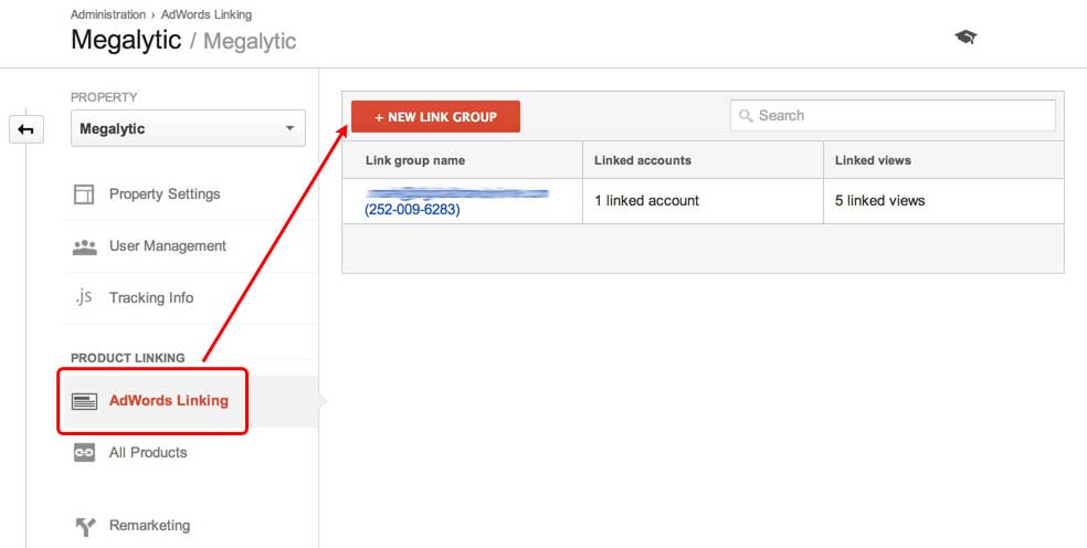 Then, click “AdWords Linking” in the Property column. From there, click “New Link Group.” You’ll then see a list of AdWords accounts connected with your login. Select the account you’d like to link and click Continue.