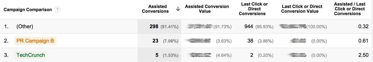 Looking at the “Last Click or Direct Conversion Values” column shows the number of people converting directly from each source. From this, we can see that TechCrunch is better at assisting than converting. PR Campaign B, on the other hand, converts more than assists.