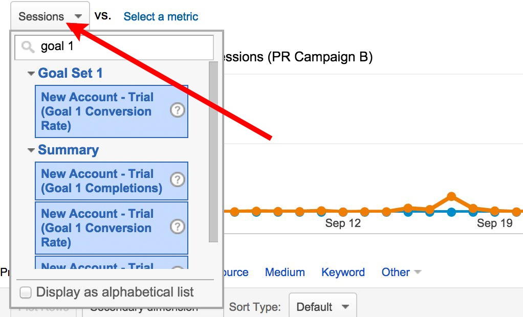 Here, we have selected “New Account – Trial (Goal 1 Completions)” to graph the conversions from each campaign.