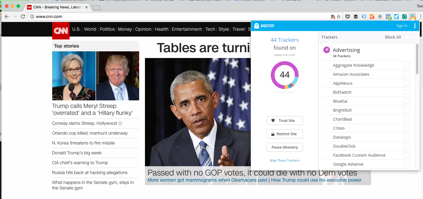 While Google Tag Assistant is tremendously helpful for assessing tracking script placement, it primarily identifies scripts from Google products and won’t pick up on many third-party codes. Ghostery allows you to pick up on tracking tags from a wide range of providers all via a single plugin. You’ll find yourself amazed at the number of tags you’ll spot on mainstream news sites, explaining in part why some major sites load so slowly at times. For instance, the plugin found 44 trackers on cnn.com.