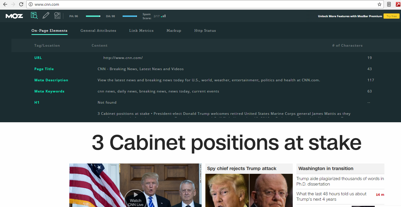 The free MozBar extension allows you to view page elements like title tags, descriptions, and headings. It also enables you to highlight internal, external and nonfollowed links on a page. Other details include canonical tags, load times status codes and more. There is a paid version that offers a great deal more insight, but both the free and paid option require a Moz account.