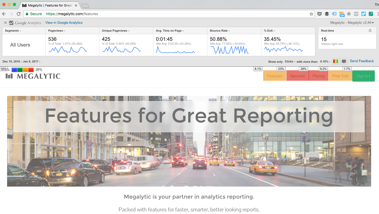 You can even modify date ranges, segments, and which metrics you view within the overlaid top bar, as well as choosing from among different Analytics views. Finally, you can overlay a heatmap of sorts to measure click volume for links on the page.