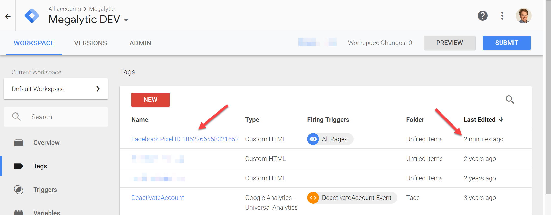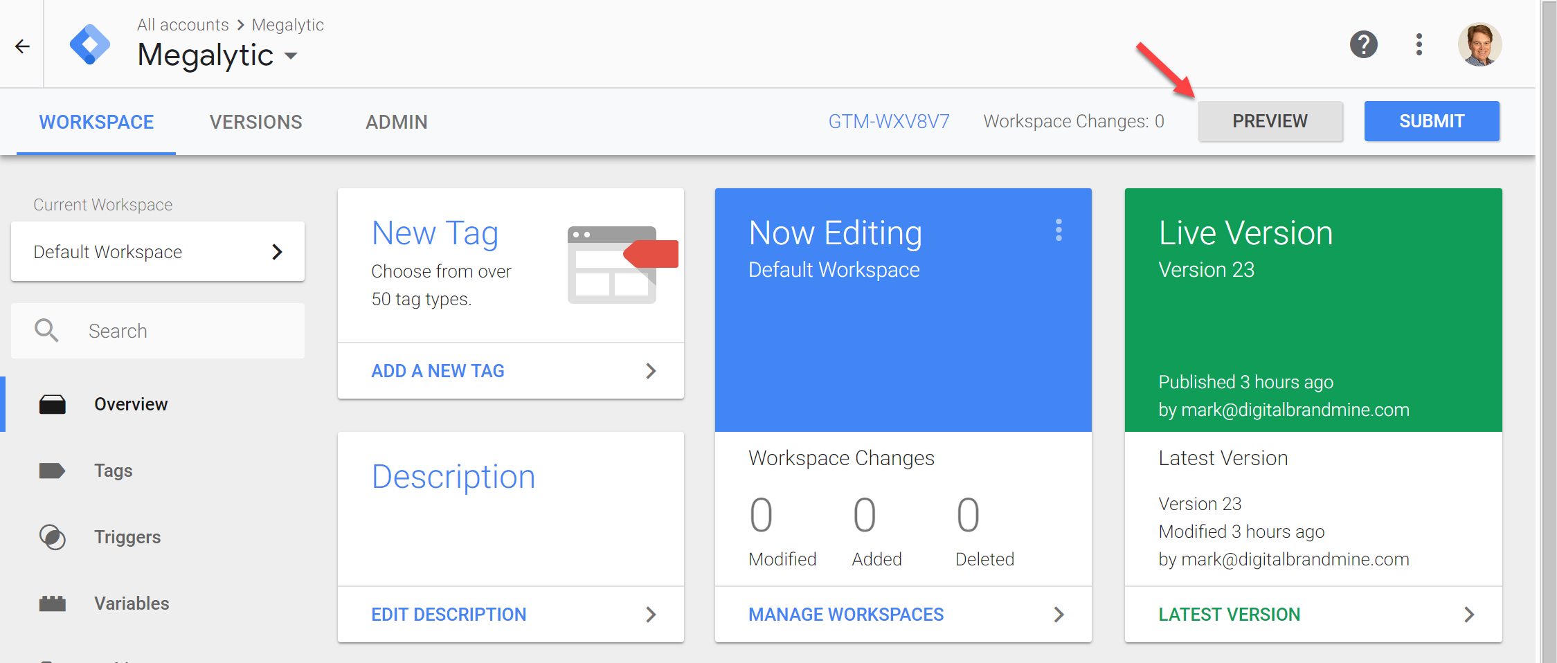 Now that you’ve created a Facebook Pixel tag in your Google Tag Manager account, you’ll need to make sure that GTM is “firing” this tag on your website pages. You can check this by using GTM Preview Mode. Just click the “Preview" button.