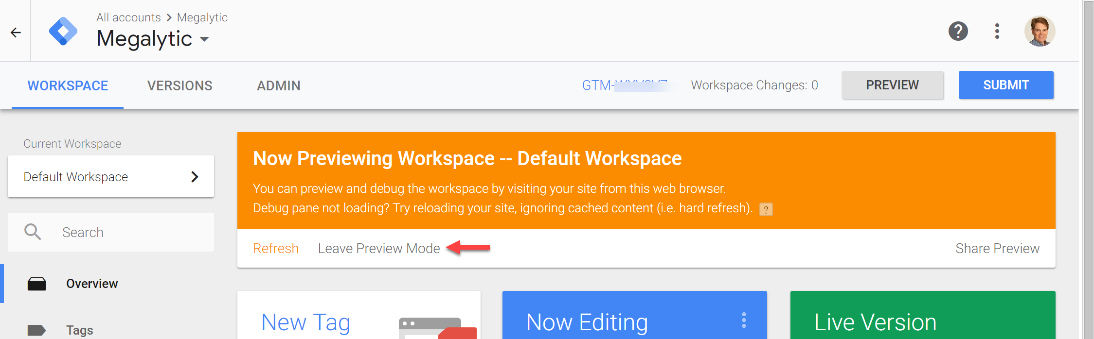 After checking your first page, take the time to navigate to a few other pages and check to see that the Facebook Pixel tag is getting fired on all of them. If it’s firing, at this point you can turn off GTM Preview Mode. To do so, click the link at the top of the GTM Workspace that says “Leave Preview Mode”.